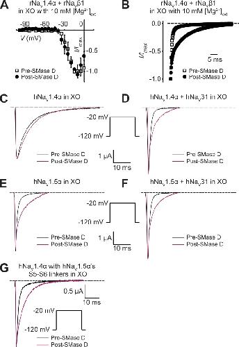 Figure 6. Effects of high Mg2+ and the NaVβ1 subunit on SMase D sensitivity of NaV channels. (A and B) rNaV1.4α + β1’s I-V curves (A) and inactivation time courses at −20 mV (B), collected in the presence of 10 mM of extracellular Mg2+ without (open squares) or with (closed circles) SMase D; all data are presented as means ± SEM (n = 3). (C–G) Currents of hNaV1.4α (C), hNaV1.4α + β1 (D), hNaV1.5α (E), hNaV1.5α + β1 (F), and mutant hNaV1.4α containing hNaV1.5α’s S5–S6 linkers (G), elicited by depolarizing the membrane from −120 to −20 mV before (black) and after (maroon) SMase D treatment. Dashed lines indicate the zero current level. |