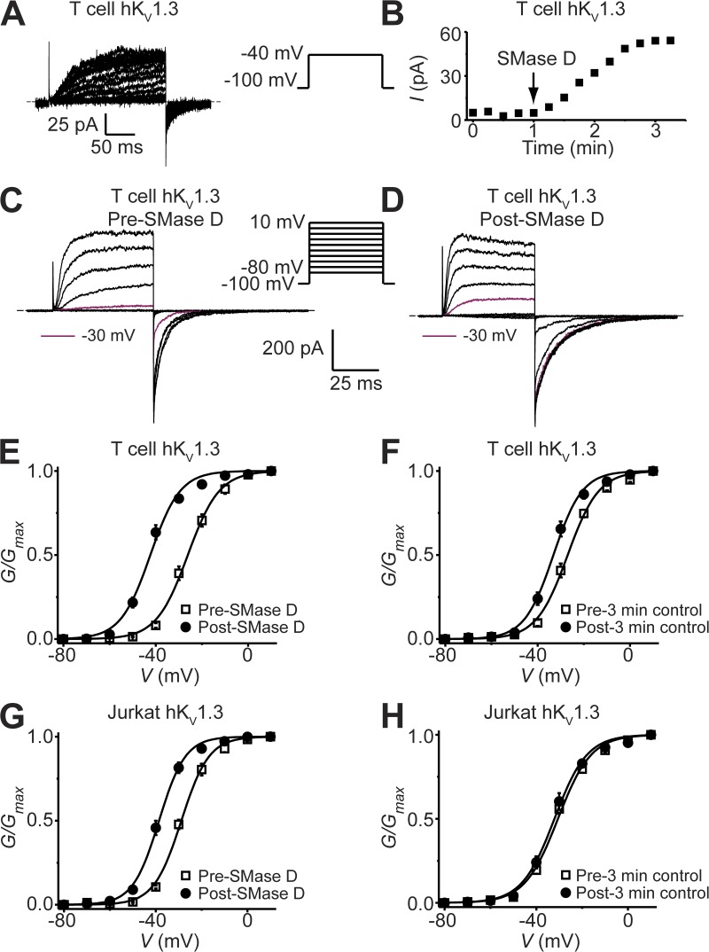 Figure 3. SMase D activates native KV1.3 channels in human T cells. (A) KV1.3 currents of a T cell recorded in the presence of 5 mM [K+]ext elicited by stepping the voltage every 15 s from the −100-mV holding potential to the −40-mV test potential. After the addition of SMase D, the current gradually increased. (B) Time course of KV1.3 current increase after the addition of SMase D. (C and D) KV1.3 currents ([K+]ext = 20 mM) elicited by stepping the membrane voltage from the −100-mV holding potential to between −80 and 10 mV in 10-mV increments at 15-s intervals before (C) and after (D) the addition of SMase D to the bath solution, where the current traces for −30 mV are colored maroon. Dashed lines in A, C, and D indicate zero current levels. (E–H) G-V curves of KV1.3 channels in T cells (E and F) and Jurkat cells (G and H) before (open squares) and after (closed circles) either a 3-min treatment with SMase D (E and G) or a 3-min control period in the absence of SMase D (F and H), where all data are presented as means ± SEM (n = 5). The curves are fits of Boltzmann functions, yielding V1/2 = −26.1 ± 0.4 mV and Z = 3.7 ± 0.2 (open squares), or V1/2 = −42.4 ± 0.6 mV and Z = 4.0 ± 0.3 (closed circles) for E; V1/2 = −27.0 ± 0.4 mV and Z = 3.8 ± 0.2 (open squares) or V1/2 = −33.2 ± 0.5 mV and Z = 4.1 ± 0.3 (closed circles) for F; V1/2 = −28.8 ± 0.4 mV and Z = 4.3 ± 0.2 (open squares) or V1/2 = −38.6 ± 0.3 mV and Z = 4.5 ± 0.2 (closed circles) for G; and V1/2 = −30.6 ± 0.5 mV and Z = 3.5 ± 0.2 (open squares) or V1/2 = −32.1 ± 0.5 mV and Z = 3.6 ± 0.2 (closed circles) for H. |