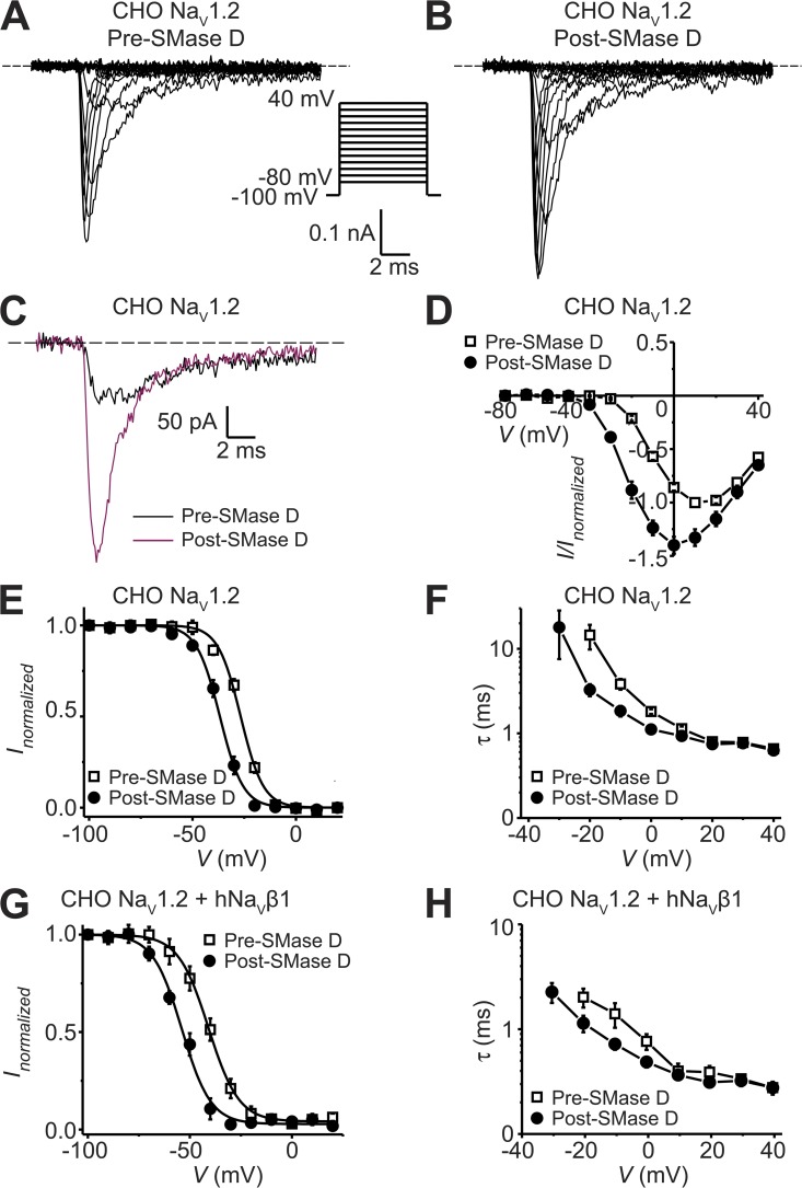 Figure 7. Effect of SMase D on native NaV channels in CHO cells. (A–C) NaV currents from a CHO cell before (A) and after (B) the addition of SMase D, elicited by stepping the membrane voltage from the −100-mV holding voltage to various test potentials between −80 and 40 mV in 10-mV increments. The current traces at −20 mV from A (black) and B (maroon) are superimposed in C. Dashed lines indicate zero current levels. (D) I-V relations before (open squares) and after (closed circles) SMase D treatment; all data are presented as means ± SEM (n = 5). (E–H) Steady-state inactivation curves (E and G) and voltage dependence of inactivation time constants (F and H) from cells expressing (G and H) or not expressing (E and F) hNaVβ1 before (open squares) and after (closed circles) SMase D treatment; all data are presented as means ± SEM (n = 5). Curves are fits to single Boltzmann functions, yielding V1/2 = −26.8 ± 0.4 mV and Z = 4.7 ± 0.3 (open squares), and V1/2 = −36.8 ± 0.3 mV and Z = 4.6 ± 0.2 (closed circles) in E; and V1/2 = −40.9 ± 0.4 mV and Z = 3.5 ± 0.2 (open squares), and V1/2 = −53.9 ± 0.7 mV and Z = 3.6 ± 0.3 (closed circles) in G. |