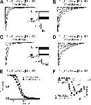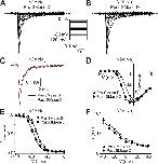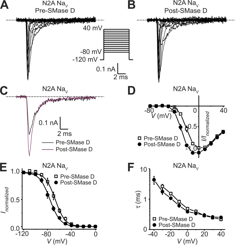 Figure 8. SMase D stimulates native NaV channels in N2A cells. (A–C) NaV currents from an N2A cell before (A) and after (B) the addition of SMase D, elicited by stepping the membrane voltage from the −100-mV holding voltage to a −120-mV prepulse and then to various test potentials between −80 and 40 mV in 10-mV increments. The current traces at −20 mV from A (black) and B (maroon) are superimposed in C. Dashed lines indicate zero current levels. (D–F) I-V relations (D), steady-state inactivation curves (E), and voltage dependence of inactivation time constants (F) before (open squares) and after (closed circles) SMase D treatment; all data are presented as means ± SEM (n = 5). Curves in E are fits to single Boltzmann functions, yielding V1/2 = −67.2 ± 0.4 mV and Z = 3.1 ± 0.1 (open squares), and V1/2 = −76.0 ± 0.3 mV and Z = 3.0 ± 0.1 (closed circles). |