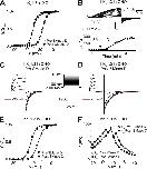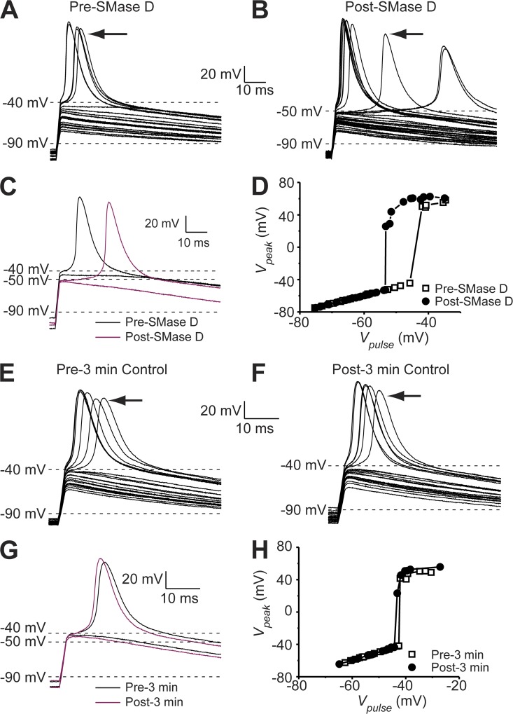 Figure 9. SMase D shifts the action potential threshold of N2A cells in the hyperpolarized direction. (A–C) Passive voltage responses and action potentials of an N2A cell elicited by several series of 2-ms current pulses between ∼200 and 500 pA in 30-pA increments before (A) and after (B) 3-min SMase D treatment. The action potentials indicated by arrows and the most depolarized passive voltage responses are replotted as black (A) and maroon (B) curves in C. (D) Peak voltages (A, open squares, and B, closed circles) plotted against the instantaneous voltage at the end of the 2-ms current pulse. (E–G) Passive voltage responses and action potentials of an N2A cell elicited by several series of 2-ms current pulses between ∼200 and 500 pA in 30-pA increments before (E) and after (F) 3-min control in the absence of SMase D treatment. The action potentials indicated by arrows and the most depolarized passive voltage responses are replotted as black (E) and maroon (F) curves in G. (H) Peak voltages (E, open squares, and F, closed circles) plotted against the instantaneous voltage at the end of the 2-ms current pulse. |