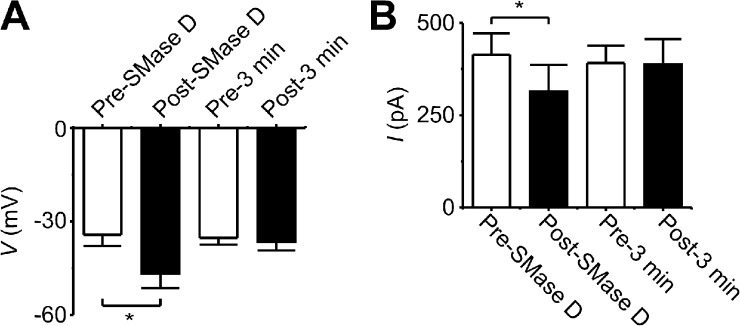 Figure 10. SMase D causes a negative shift in the action potential threshold and reduces the amount of injected current required to depolarize the membrane potential to the action potential threshold. (A) Averaged action potential threshold voltage (means ± SEM; n = 5) before (white) and after (black) SMase D treatment (P < 0.01) or before (white) and after (black) 3-min control without SMase D treatment. (B) Average injected current required to depolarize the membrane potential to the threshold (means ± SEM; n = 5) before (white) and after (black) SMase D treatment (P < 0.01) or before (white) and after (black) 3-min control without SMase D treatment. The p-values were calculated with a paired-sample, two-tailed t test method. |