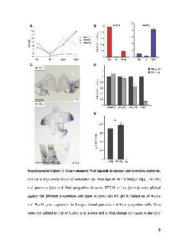 Supplemental Figure 4. Non-canonical Wnt ligands in mouse and Xenopus embryos. (A) Gene expression levels of non-canonical Wnt ligands in the foregut (fg), liver (lv) and pancreas (vpa and dpa) progenitor datasets. FPKM values (y-axis) were plotted against the different progenitors cell types (x-axis). (B) RT-qPCR validation of Wnt5a and Wnt5b gene expression in foregut, dorsal pancreas and liver progenitor cells. Data were normalized to that of SDHA and represented as fold change compared to the E8.5 8 foregut sample (set to 1 as calibrator). Error bars represent ± SEM. (C) In situ hybridization analysis validated the expression of Wnt5a in the E8.5 foregut endoderm (see red arrowheads) and adjacent lateral plate mesoderm (lpm). At E10.5, Wnt5a transcript was abundant in the limbs (Yamaguchi et al. 1999) and mesenchyme surrounding the midgut and pancreatic rudiments (demarcated by dotted yellow line), whereas its expression in pancreatic epithelial cells became weaker. Scale bars, 50 μm. (D) RT-qPCR of Xenopus Wnt5a, Wnt5b and Wnt7b gene expression in endodermal explants. Both anterior (AE) and posterior endoderm (PE) explants were dissected at stage 10, cultured in isolation until stage 28 and assayed for expression of the indicated genes by RT-qPCR analysis. Data were normalized to that of ODC and represented as fold changes compared to AE sample (set to 1 as calibrator). Error bars represent ± SEM. Wnt5a and Wnt5b were detected in both endoderm populations without any significant regionalized expression, whereas Pdx1 was expressed only in AE derivatives, including the pancreas. (E) Analysis of cell proliferation at early tadpole stages (stages 32-34) revealed no significant differences between control (CTRL) and Wnt5a-injected embryos. Wnt5a mRNA was co-injected with β-gal mRNA into AE cells (dorsal vegetal cells) of 8- cell stage Xenopus embryos. Embryos were fixed at stages 32-34, stained for pHH3 and cleared with benzyl alcohol/benzyl benzoate. Subsequently, the number of pHH3+ cells relative to the anterior gut area (LacZ-staining positive area) was measured in transparent embryos. All results are expressed as means ± SEM. n=8 CTRL embryos; n=15 Wnt5a- injected embryos. Abbreviations: fg, foregut; dpa, dorsal pancreas; lpm, lateral plate mesoderm; lv, liver; vpa, ventral pancreas; AE, anterior endoderm; PE, posterior endoderm; ns, not significant. |