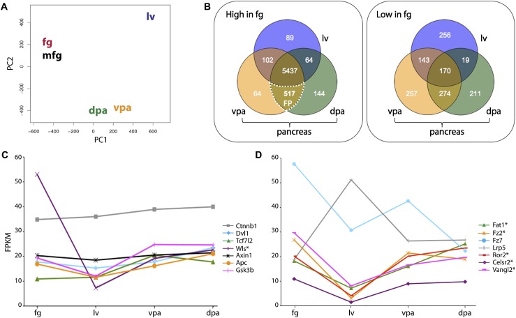 Figure 2. Temporal and spatial integration analysis of the RNA-seq-derived transcriptome profiles. (A) PCA shows that the RNA-seq-derived transcriptome profiles are characteristic of different progenitor cell types (for detailed description, see the Materials and Methods). (B) Venn diagrams showing the number of unique and common highly expressed transcripts between progenitor cells at different developmental stages. To further focus our analysis on subsets of genes with distinct expression patterns, we divided the working data set into two groups based on a cutoff for high expression (defined as FPKM = 10, at approximately the 50th percentile of RNA-seq expression for each sample). Of 14,053 genes, 8110 could be categorized in the defined Venn regions. For example, 5437 genes exhibited relative abundance values of >10 FPKM in all samples, while 517 genes were highly expressed in the foregut, vpa, and dpa but not in the liver (referred to as group FP). In contrast, 89 genes were highly expressed in the foregut and liver but not in the vpa and dpa. Three-hundred-sixty-three transcripts were present (>10 FPKM) only in the fg but not in the liver, dpa, and vpa (not shown in the diagram). As shown in the PCA plot in A, fg and mfg were highly similar; therefore, these samples were combined together as “foregut” to simplify the visualization. (C,D) Levels of Wnt signaling pathway gene expression across the fg, liver (lv), vpa, and dpa progenitors. FPKM values (Y-axis) were plotted against the different progenitors cell types (X-axis). (*) Wnt factors present in the 150 FP group transcripts that showed significant differential regulation between the pancreas and liver. |