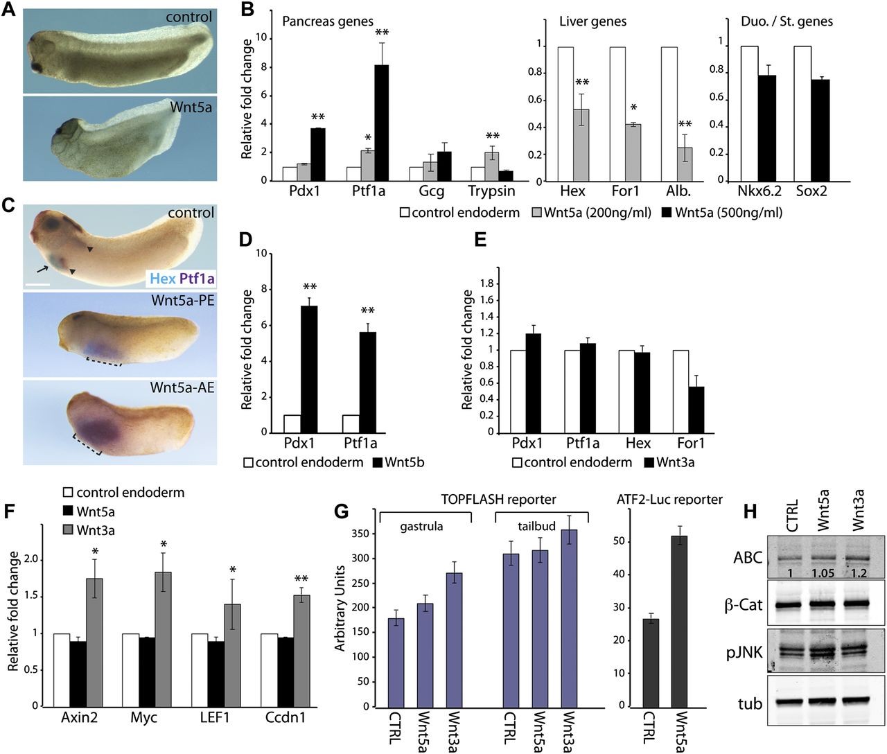 Figure 4. Noncanonical Wnt5a activity promotes pancreatic versus hepatic fate in the anterior endoderm. (A) Xenopus embryos injected with Wnt5a mRNA showed a shortened and mildly bent body at the tailbud stage, as previously described (Kim et al. 2005). (B) Endodermal explants were cultured in the presence of Wnt5a recombinant protein from stage 10, collected at the tadpole stage, and assayed for expression of the indicated pancreatic, hepatic, and duodenum/stomach genes by RT-qPCR analysis. Untreated anterior endodermal explants were used as control. Data were normalized to that of ornithine decarboxylase (ODC) and are represented as fold changes compared with untreated endoderm sample (set to 1 as calibrator). Error bars represent ±SEM. (C) Whole-mount double in situ hybridization analysis of Hex (light blue) and Ptf1a (purple) in control and Wnt5a-injected Xenopus embryos at the tadpole stage. The arrow indicates Hex expression in the liver bud, and arrowheads indicate Ptf1a expression in the two pancreatic buds (dorsal and ventral buds). Dashed lines mark expanded Ptf1a expression in the injected embryos. Total number of injected embryos = 61; 41% showed visible expansion of Ptf1a. (AE) Anterior endoderm; (PE) posterior endoderm. (D) RT-qPCR analysis of endodermal explants treated with Wnt5b (200 ng/mL) recombinant protein. Data were normalized to that of ODC and are represented as fold changes compared with untreated endoderm sample (set to 1 as calibrator). (E) RT-qPCR analysis of endodermal explants treated with 500 ng/mL Wnt3a recombinant protein. Data were normalized to that of ODC and are represented as fold changes compared with untreated endoderm sample (set to 1 as calibrator). (F) RT-qPCR analysis of direct downstream target genes of the Wnt/β-catenin pathway in endodermal explants treated with 500 ng/mL Wnt5a or 500 ng/mL Wnt3a recombinant protein. Data were normalized to that of ODC and are represented as fold changes compared with untreated endoderm sample (set to 1 as calibrator). (G) TOPFLASH and ATF2-luc reporter assays in Xenopus embryos. Four-cell stage embryos were injected into the vegetal blastomeres with 50 pg of TOPFLASH or 100 pg of ATF2-luc plus 25 pg of Renilla luciferase reporter plasmids. Endodermal explants were dissected at stage 9 and either left untreated as control (CTRL) or exposed to 500 ng/mL Wnt5a or 500 ng/mL Wnt3a recombinant protein, as indicated. Luciferase reporter assays were carried out in explants lysed at gastrula and early tailbud stages. (H) Western blot analysis of dissected anterior endodermal explants either left untreated as control (CTRL) or exposed to Wnt5a or Wnt3a recombinant protein. The relative ABC/tubulin levels in the treated explants compared with the control, which was set to 1.0, are indicated. (β-cat) Total β-catenin; (tub) α-tubulin. (*) P < 0.05; (**) P < 0.01, as determined by the REST program statistical analysis (Pfaffl et al. 2002). |