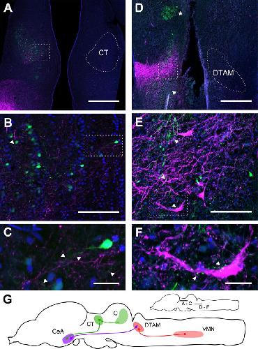 Figure 3. CeA connects to auditory and vocal circuits. A, Horizontal section through the dorsal thalamus after CeA (green) and IC (magenta) injections (rostral up). Green back-labeled CeA-projecting cells overlap anterogradely labeled terminal field of IC axons (magenta) within CT (see white overlay on contralateral hemisphere). Magenta at lower left is a fiber tract that originates from the injection site (located just below the bottom of the panel). Scale bar, 500 μm. B, Expanded view of region indicated by the dashed box in A, showing the overlap of back-labeled cells and the IC terminal field in greater detail. Proximal dendrites can be seen extending from back-labeled cell bodies (arrowhead). Blue channel is nuclear label from DAPI staining. Scale bar, 50 μm. C, Expanded view of region indicated by the dashed box in B, showing magenta axon boutons making apparent contact with proximal dendrites of green back-labeled CT cells (see arrowheads). Scale bar, 20 μm. D, Horizontal section through the tegmentum and DTAM after CeA (green) and VMN (magenta) injections (rostral up). VMN injection labels both cells and terminal fields within DTAM (dashed box) and overlaps with the green terminal field of labeled CeA axons. White overlay on the contralateral hemisphere outlines the boundaries of DTAM at this level. Green terminal fields from CeA are also visible in the more rostral pedunculopontine tegmental nucleus (asterisk) and the nucleus of the tractus solitarus (arrowhead) located just caudal to DTAM. Scale bar, 500 μm. E, Expanded view of region indicated by the dashed box in D, showing overlap of back-labeled VMN-projecting cells and the CeA terminal field in DTAM. Instances of putative overlap of CeA axonal boutons (green) and VMN-projecting DTAM cells (magenta) are indicated by arrowheads. Blue channel is nuclear label from DAPI staining. Scale bar, 50 μm. F, Expanded view of region indicated by E, showing the overlap of axon boutons and proximal dendrites in greater detail. Scale bar, 20 μm. G, Schematic views of the entire brain of X. laevis in the sagittal orientation, showing the location of sections (lines) and a summary diagram of the connections described in Figures 1 and 2. Green represents auditory nuclei; red represents vocal nuclei. |