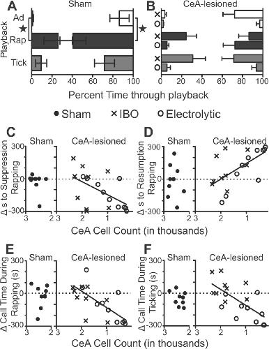 Figure 5. The response to playbacks was altered by CeA lesion. A, The time to suppression of calling (left y-axis) and the time to the resumption of calling (right y-axis) during playback are plotted for advertisement (Ad), rapping, and ticking. Sham-lesioned males suppressed earlier and resumed calling later during advertisement playbacks than rap playbacks (stars; Friedman, Dunn's multiple comparison, Q = 6.5, p = 0.03 for suppression; Q = 9.2, p = 0.006 for resumption). Advertisement playbacks were 15 min long; rap and tick playbacks were 5 min long, so that the x-axis is normalized for the duration of each playback. B, Using the same conventions as in A, CeA-lesioned animals show prolonged vocal suppression during advertisement, rap, and ticking playbacks. After IBO or electrolytic lesion, there was no significant difference in the time to suppression or resumption of calling during any playback (suppression: Friedman, IBO, Q = 6.0, p = 0.057; electrolytic, Q = 3.211, p = 0.1873; resumption: Friedman, IBO, Q = 0.9630, p = 0.5690; electrolytic, Q = 3.0, p = 0.2223). C, D, The prelesion to postlesion change in time to suppression (C) and time to resumption (D) was correlated with the number of cells remaining in the posterior CeA after lesion. The x-axes are reversed, with higher cell counts on the left and lower on the right. The y-axis was calculated as ([post lesion behavior] − [prelesion behavior]), so positive numbers indicate greater postlesion values. The fewer cells remaining in the CeA, the more rapid the time to calling suppression (C, Pearson's r = 0.54, p = 0.020) and the longer the time until call resumption (D, Pearson's r = −0.62, p = 0.01). E, F, The prelesion to postlesion change in the duration of calling during rapping (E) and ticking (F) playbacks was correlated with the number of cells remaining in the posterior CeA after lesion. The fewer cells remaining in the CeA, the less animals called during rapping (E, Pearson's r = 0.69, p = 0.001) or ticking (F, Pearson's r = 0.68, p = 0.001). |