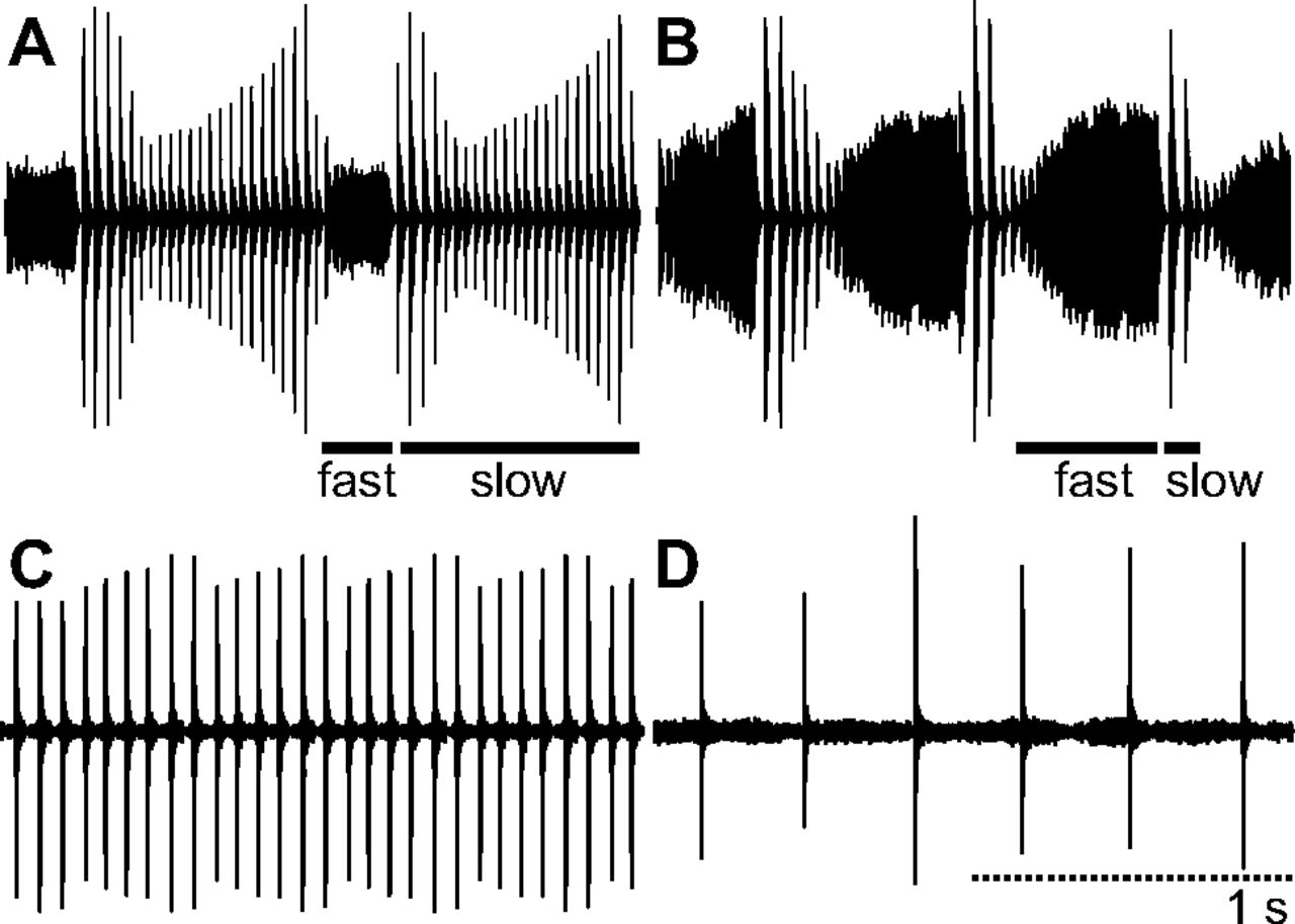 Figure 1. Example oscillograms of the male and female X. laevis calls described in this study. For male advertisement (A) and answer calls (B), the fast and slow trill phase of a single call are underlined. Female rapping (C) and ticking (D) communicate sexual receptivity or nonreceptivity, respectively. Each call segment is 2 s in duration. |