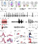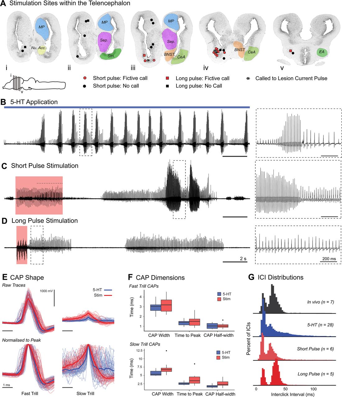 Figure 4. Fictive calling can be elicited by stimulation of CeA and BNST. A, Transverse sections through the X. laevis forebrain. Locations of stimulation sites within the telencephalon are coded by type of stimulation and success in eliciting calling on the left hemisphere, whereas colored regions on the right hemisphere indicate the extent of the different telencephalic nuclei (or groups of nuclei, in the case of the septum) that were stimulated. Nu. Acc., Nucleus accumbens; MP, medial pallium; Sep., septum; Stri., striatum. The approximate locations of each section (iâv) are indicated by the vertical lines on the frog brain schematic at the bottom left (sagittal view, rostral to the left). B, Fictive calling in response to 5-HT. The trace shows a 20 s excerpt of laryngeal nerve activity taken from a longer calling bout (â¼2 m) during a 3 min bath application of 5-HT (indicated by the blue box above the trace). In this case, 5-HT was applied â¼25 s before the beginning of this trace. Inset to the right, Dashed area with an enlarged time-scale, demonstrating the alternating biphasic pattern of the fictive calling episode. Nerve activity consists of highly synchronized CAPs, organized into biphasic alternating trills. Calibration: B, 2 s; inset, 200 ms. C, Biphasic fictive calling elicited by short pulse stimulation of CeA. Trace represents laryngeal nerve activity during and after the stimulus train. Red box represents the timing and duration of the stimulus train (0.2 ms pulse duration, 30 Hz). A short monophasic trill occurs during the second half of the stimulus train (dashed overline, CAPs obscured by stimulus artifacts), followed â¼4 s later by a repeating biphasic trill. Inset, Dashed area with an enlarged time-scale, demonstrating the alternating biphasic pattern of the fictive calling episode. Calibration: C, 2 s; inset, 200 ms. D, Monophasic calling episode after stimulation in CeA. Nerve activity during and after a long pulse stimulus train (indicated by the red box, long pulse: 2 ms duration, 60 Hz) shows two monophasic trills after stimulation: one immediately after the cessation of the stimulus train (expanded time-scale of the dashed region shown in inset) and the second â¼5 s later. Calibration: D, 2 s; inset, 200 ms. E, Individual CAPs elicited by 5-HT and electrical stimulation (stim) from the same brain. Fast trill CAPs have similar shapes and heights regardless of mode of stimulation, whereas slow trill CAPs are less stereotyped both within and between modes of stimulation. Individual CAPs were extracted from 1- to 2-s-long stretches of fictive calling activity for periods of both 5-HT and electrically stimulated fictive calling in a single brain (stimulation CAPs in this example come from the trace shown in B). Plots represent 5-ms-long stretches of N.IX-X nerve activity centered on the peak of the CAP with individual CAPs overlaid. All CAPs originated from periods of alternating biphasic calling, but only those that could be reliably assigned to fast or slow trills were used for this plot. Upper row, Raw CAP traces separated into fast and slow trill groups and color-coded by the mode of stimulation that elicited them. Fast and slow CAPs are both plotted with the same vertical scale (vertical scale bar represents 1000 mV). Thicker lines represent the mean across all individual CAPs of that type represented on this plot. Lower row, Same CAPs normalized by peak height for both fast and slow trills, again color-coded by the mode of stimulation, with bold lines representing the mean of all CAPs in each group. Horizontal scale bar for each plot represents 1 ms. F, CAP width, time to peak, and CAP half-width displayed as box-and-whisker plots for fast trill and slow trill CAPs elicited by 5-HT and electrical stimulation. Measurements from 25 instances of each type of CAP (fast and slow for 5-HT and stim-elicited episodes) were averaged to produce a single value for each type of CAP for each brain that produced fictive calling episodes to both modes of stimulation. Upper plots, Values for fast trill CAPs; lower plots, those for slow; both plots, color coded for mode of stimulation. Thick line indicates the median across all brains; box represents the upper and lower quartiles, with tails showing the upper and lower extremes. Black dots indicate outliers (>3 SD above median). G, ICI histograms showing the bimodal distribution of in vivo and fictive calling. All measured clicks (in vivo) and CAPs (fictive) were pooled across brains and calling episodes, and in aggregate show bimodal distributions with a âfastâ peak centered at â¼16 ms and a broader âslowâ peak whose mean ICI is more variable between conditions. The n value indicates the number of frogs or brains that data were pooled from for each condition. |