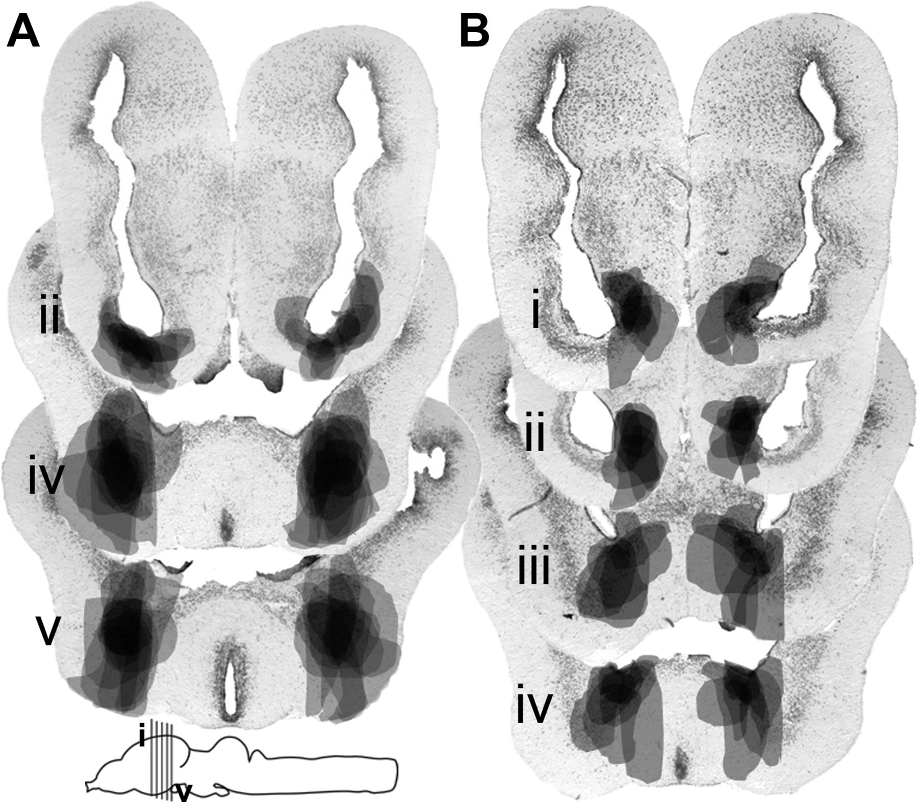 Figure 6. Transverse sections through the X. laevis forebrain at the level of the CeA and BNST. Electrolytic lesion sites for (A) the CeA (n = 12) and (B) the BNST (n = 9) were traced, colored gray, and overlain. Inset, Schematic of a sagittal view of the frog brain (rostral left) with vertical lines indicating the approximate level of the sections. |