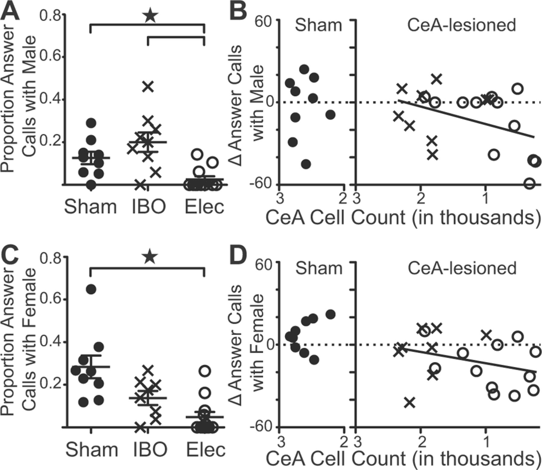Figure 7. Answer call production decreases after CeA lesion. A, The proportion of answer calls to all calls produced by a lesioned frog when paired with another male frog for 10 min was significantly reduced after electrolytic lesion of the CeA. Star and brackets indicate significantly different populations (Kruskal–Wallis K = 14.8, p = 0.001). B, The prelesion to postlesion change in the number of answer calls produced during an interaction with a male frog was correlated with the number of cells remaining in the CeA (male: Pearson's r = 0.39, p = 0.046). C, The proportion of answer calls directed at a female frog during a 10 min interaction was significantly reduced after electrolytic lesion of the CeA (Kruskal–Wallis K = 13.05, p = 0.002). D, The prelesion to postlesion change in the number of answer calls produced during an interaction with a female frog was correlated with the number of cells remaining in the CeA (Pearson's r = 0.44, p = 0.026). |