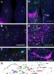 Figure 2. CeA and BNST in X. laevis. A, Schematic view of the caudal portion of the ventral telencephalon in X. laevis, viewed from below (rostral up). The boundaries of BNST and CeA are indicated on each hemisphere, with their respective associated fiber pathways overlaid on the left hemisphere: green represents LFB; orange, ST [stria terminalis]. Diagram single neurons in each nucleus show the typical orientation of cell bodies and dendrites in the nucleus with respect to the forebrain ventricle (not pictured) and the fiber tract. In the right hemisphere, the location of the adjacent nuclei of the basal ganglia is shown in white: Str., Striatum; EA, entopeduncular area, a pallidal homolog. A1, Schematic view of the entire brain of X. laevis in the sagittal orientation, showing the location of sections (lines) and whole-mount views (gray boxes) from subsequent parts of the figure. B, LFB and axon terminal field within the ventral subpallium labeled by CT injection in a whole-mount brain. z-stack image (500 μm thick) through caudal ventral telencephalon (horizontal plane, rostral up). The CeA is outlined by a white overlay. Arrowhead indicates back-labeled EA cells. Scale bar, 250 μm. C, CT cells back-labeled by CeA injection in a whole-mount brain. z-stack image (500 μm thick) through dorsal thalamus (horizontal plane, rostral up). Scale bar, 250 μm. D, Caudal telencephalon in a whole-mount brain after double-label with CT (green) and DTAM (magenta) injections. z-stack image (375 μm thick) in the horizontal plane (rostral up). Arrowheads indicate back-labeled DTAM-projecting cells (magenta). Although the green CT axons extend into the more rostrally located striatum, the DTAM terminal field and DTAM-projecting cells are restricted to the caudal portion of the subpallium. No back-labeled cells are seen in EA after DTAM injection. Axons connecting CeA and DTAM are also contained within the LFB, but in a more medial location than CT axons (green). Back-labeled cells (both magenta and green) can also be seen in APOA (asterisk). Scale bar, 250 μm. E, High-power (40Ã) image of anterogradely labeled CT axons (green) within the LFB interacting with locally labeled CeA dendrites (magenta). Horizontal section, rostral up. Scale bar, 50 μm. Dashed boxes indicate the areas shown at expanded magnification in the inset. Arrowheads indicate three example sites of putative synaptic contacts between boutons and spines. F, Transverse section through caudal telencephalon just rostral to APOA after double-label with CT (green) and DTAM (magenta) injections. The CT axon terminal field is clearly restricted to the outer half of the CeA dendritic fields and neatly overlaps the more proximally located terminal field (asterisk) and cell bodies back-labeled by DTAM injection. The combination of DTAM and CT labeling delineates the border of CeA with the BNST medially and the medial amygdala dorsally (see white overlay on contralateral side). Scale bar, 500 μm. G, Synaptophysin (SYP) puncta (magenta) located on CT axons (green). High-power (63Ã) z-stack image (4.5 μm thick) in the horizontal plane (rostral up). Arrowheads indicate two example puncta located on axons labeled by tracer injection into CT. Scale bar, 10 μm. H, Axon terminal fields within CeA and BNST labeled by contralateral CeA injection. z-stack image (400 μm thick) in the horizontal plane (rostral up). White dashed overlay outlines the BNST area as distinct from CeA. The projection from CeA is bilateral; however, terminal fields within the ipsilateral hemisphere are obscured by the proximity of the dye injection. Back-labeled cells within APOA can be seen at lower right (asterisk). Scale bar, 250 μm. |