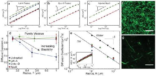 Figure 2. Actin disruption leads to purely viscous nuclear propertiesa, In Lat-A-treated oocytes, the MSD for all bead sizes exhibited diffusive-like behavior. Green: R=0.1 μm (19 z-positions from 9 GVs, 20,224 particles identified), blue: R=0.25 μm (28 z-positions from 15 GVs, 8,950 particles identified), black: R=0.5 μm (23 z-positions from 14 GVs, 3,261 particles identified), red: R=1.0 μm (23 z-positions from 11 GVs, 1,642 particles identified). b, Similar behavior was observed in Cyto-D treated oocytes. Green: R=0.1 μm (13 z-positions from 6 GVs, 7,754 particles identified) and red: R=1.0 μm (9 z-positions from 5 GVs, 382 particles identified). c, Similar behavior was observed in GVs injected with Xpo6 to deplete actin. Green: R=0.1 μm (21 z-positions from 10 GVs, 42,411 particles identified) and red: R=1.0 μm (13 z-positions from 5 GVs, 1,218 particles identified). d, Under actin-disrupting conditions (Lat-A, Cyto-D, and Xpo6), α ≈1 for all bead sizes, while α < 1 for large beads in native GVs. e, The diffusion coefficient, D, of beads in actin-disrupted GVs exhibits a roughly R−1-dependence expected from the Stokes-Einstein equation; small beads in untreated GVs have a comparable value of D (blue square). Solid black symbols are beads diffusing in water. The color scheme is as in d. Inset shows the scaled MSD·R against lag time. f, Lifeact::GFP image showing the native actin network in a live GV. g, Lifeact::GFP image of the fragmented actin network after Lat-A treatment. Scale bars = 5 μm. |