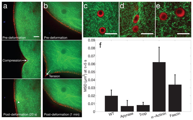 Figure 3. Mechanics, anchoring and structural regulation of nuclear actina, Compressive forces were applied to the GV using a microneedle, demonstrating a coupled elastic response of the actin meshwork (Lifeact::GFP, green) and lamin cortex (RFP::Lamin B3, red). Arrowhead shows increased intensity, suggesting actin polymerization occurs in response to force. b, Tensile forces were applied to the GV using a microneedle, showing a similar coupled elastic response. c, Two nuclear bodies trapped in a dense native actin meshwork. d, Tropomyosin injection leads to a compacted actin meshwork, and the nuclear bodies are often deformed. e, Fascin injection leads to bundling of the actin meshwork. For c–e, nucleoli are labeled with NPM1::RFP (red), and actin is labeled with Lifeact::GFP (green). d, Bar graph showing the MSD of large (R=1 μm) beads at a lag time of 5 sec, under various conditions: untreated (n=35 z-positions from 14 GVs, 3,011 particles identified), apyrase (n=13 z-positions from 4 GVs, 617 particles identified, p-value = 0.22), tropomyosin (n=24 z-positions from 12 GVs, 1,278 particles identified, p-value = 0.16), alpha-actinin (n=18 z-positions from 5 GVs, 1,254 particles identified, p-value = 0.05), and fascin (n=39 z-positions from 18 GVs, 2,123 particles identified, p-value = 0.34). Error bars = s.e.m. Scale bar is 10 μm in all images. |