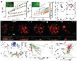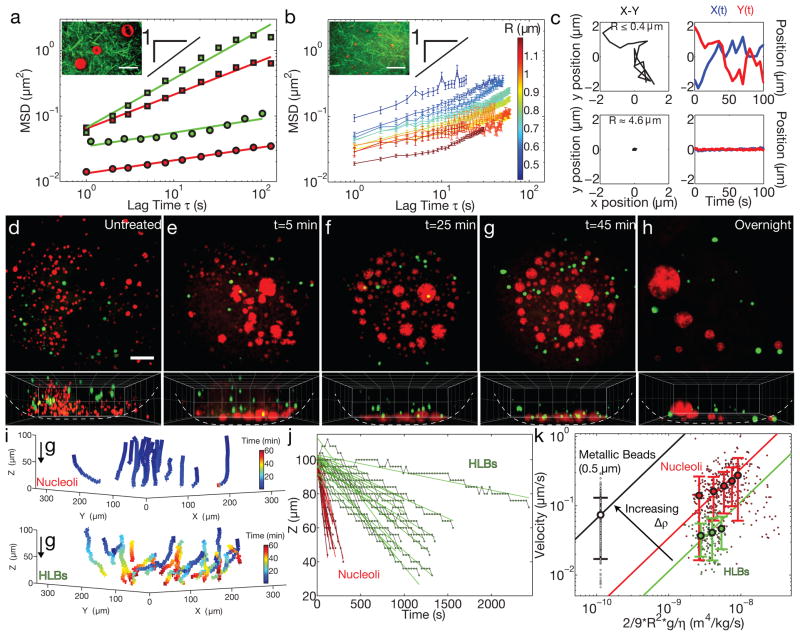 Figure 4. Actin disruption results in sedimentation and fusion of nuclear bodiesa, 2D MSD of RNP bodies shows highly constrained motion in native GVs (circles). Red: nucleoli (R>2 μm) (11 z-positions from 5 GVs, 320 bodies identified) and green: HLBs (16 z-positions from 10 GVs, 232 bodies identified). In latrunculin-treated GVs (squares) these RNP bodies are more mobile. Red: nucleoli (R>2 μm) (10 z-positions from 6 GVs, 442 bodies identified) and green: HLBs (9 z-positions from 5 GVs, 149 bodies identified). Inset shows a few large nucleoli embedded in an F-actin meshwork visualized by Lifeact::GFP. Scale bar = 10 μm. b, A sub-population of small nucleoli (“micronucleoli,” R<2 μm) are more mobile, and occasionally exhibit intermittent dynamics (“cage hopping”) in native GVs. Inset shows micronucleoli inside a meshwork labeled with Lifeact::GFP. (n=number of displacements at a given lag time per nucleolar size from 11 z-positions from 7 GVs, 240 bodies identified). Error bars = s.e.m. Scale bar = 10 μm. c, Left column shows example X-Y trajectories for a representative micronucleolus (top) and a typical large nucleolus (bottom). The right column shows corresponding temporal changes in position, X(t) and Y(t). For d–h, top images show a maximum intensity projection of a 100-micron thick section of nucleoli labeled with NPM1::RFP (red) and HLBs labeled with GFP::Coilin (green), and bottom images show a 3-D rendering in the X-Z plane. d, Nucleoli and HLBs are suspended in an untreated GV. For e–g, time-lapse images are from the same GV from a Lat-A treated oocyte; time refers to minutes after dissection. h, Large nuclear bodies that form overnight after actin disruption by Lat-A. Scale bar = 50 μm. 3D grid size = 50 μm. i, 3D representation of nucleoli (top) and HLB (bottom) trajectories after actin disruption in the GV shown in e–g. j, The vertical position of nuclear bodies (red: nucleoli R>2 μm, and green: HLBs) from i as a function of time. k, The sedimentation velocity plotted against normalized size. Black: metallic R=0.5 μm beads (n=16 movies of 16 GVs, 237 tracks analyzed), red: nucleoli (R>2 μm) (n=17 movies of 16 GVs, 394 tracks analyzed) and green: HLBs (n=18 movies of 12 GVs, 149 tracks analyzed). Larger circles represent binned data points and solid lines are linear fits of the data, with the slope representing the buoyant density. Error bars = s.d. |
