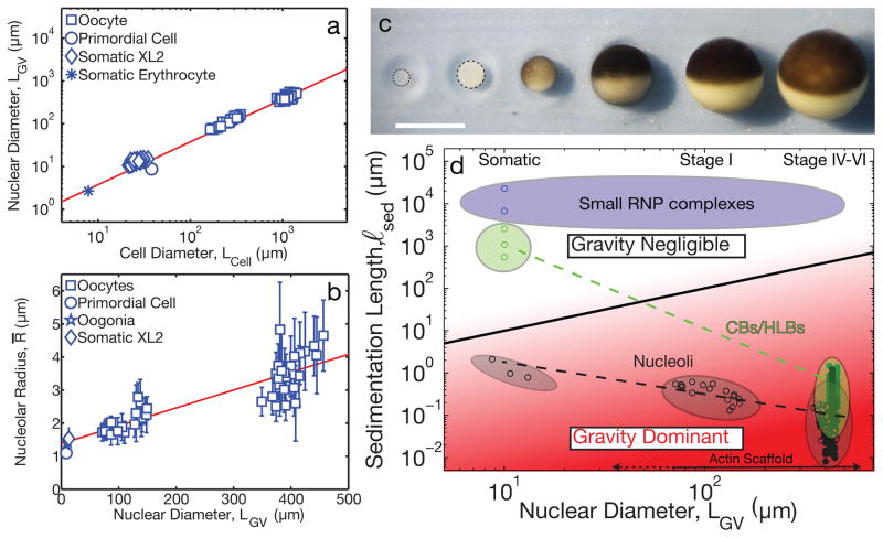 Figure 5. Cell size, organelle scaling, and gravitya, Linear scaling was observed between nuclear diameter, LGV, and cell diameter, Lcell from Stage I, IV, V, and VI oocytes and estimated from the literature (Supplementary Note). b, Linear scaling found between average nucleolar radius and nuclear diameter based on measurements in Stage I, IV, V and VI oocytes and estimated from literature (Supplementary Note). Nucleoli were measured from late stage oocytes (n=8 GVs), intermediate stage oocytes (n=17 GVs) and early stage oocytes (n=17 GVs). Error bars = s.d. Red solid line is the weighted best-fit line of the data. c, Cell growth during oogenesis in X. laevis. Each of the six stages is shown. Scale bar = 1 mm. d, State diagram of ℓsed vs. LGV. Black solid line separates region where gravity is negligible (white, ℓsed > LGV) from region where gravity dominates (red, ℓsed < LGV). Measurements (closed circles) and approximations (open circles) (Supplementary Note) are plotted for different nuclear bodies (black: nucleoli, green: HLBs/CBs, blue: small RNP complexes). For nuclear diameters > 10 μm, gravity becomes increasingly dominant for both HLBs and nucleoli, requiring a stabilizing F-actin scaffold. |
