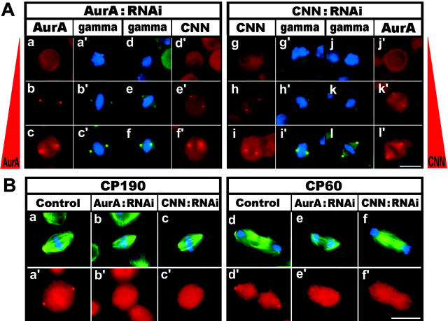 Figure 2. Immunolocalization of centrosome proteins at the spindle pole. (A) Double staining of mitotic S2 cells with Aurora-A/γ-tubulin and CNN/γ-tubulin after depletion of either Aurora-A (a–f) or CNN (g–l) by RNAi. DAPI staining is also shown in cells labeled with γ-tubulin (gamma). Different amounts of Aurora-A and CNN remained at the pole in depleted cells. Aurora-A and CNN are dependent on one another to localize at the spindle pole, and two proteins are required for recruiting γ-tubulin to the centrosome. (B) Localization of CP190 (a′–c′) and CP60 (d′–f′) in control (a and d), Aurora-A–depleted (b and e), and CNN-depleted (c and f) cells. The cells were also stained with α-tubulin and DAPI (a–f). Although depletion of Aurora-A and CNN predominantly induced abnormal spindles in monopolar/multipolar organization, spindles in bipolar orientation were selected to demonstrate the absence of centrosomal proteins at each pole. Bars, 10 μm.
