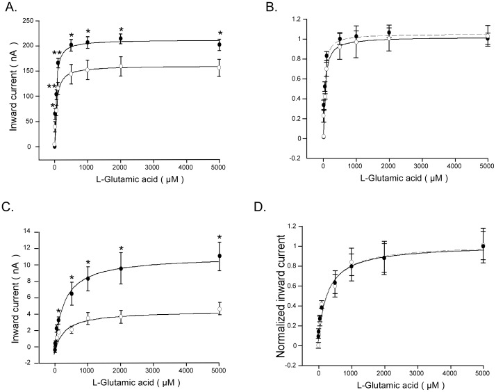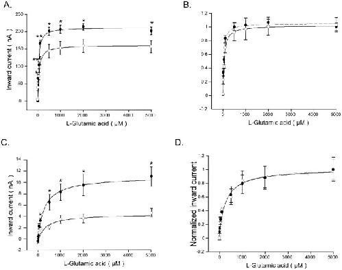 Figure 2. Glutamate-induced currents as a function of glutamate concentration in EAAT3/EAAT4-expressing Xenopus oocytes wihout or with Klotho coexpression.A, C: Means ± SEM of glutamate-induced current (Iglu) as a function of glutamate concentration in Xenopus oocytes injected with cRNA encoding EAAT3 (A, n = 9) or EAAT4 (C, n = 6) without (open circles) or with (closed circles) additional coexpression of Klotho.*,**(p<0.05, p<0.01) indicate statistically significant difference from Xenopus oocytes injected with cRNA encoding EAAT3 (A) or EAAT4 (C) alone (two-tailed unpaired t-test). B, D: Means ± SEM of glutamate induced current (Iglu) normalized to Iglu at 5 mM glutamate as a function of glutamate concentration in Xenopus oocytes injected with cRNA encoding EAAT3 (B, n = 9) or EAAT4 (D, n = 6) without (open circles) and with (closed circles) additional coexpression of Klotho. The values were fitted to a hyperbola function. |