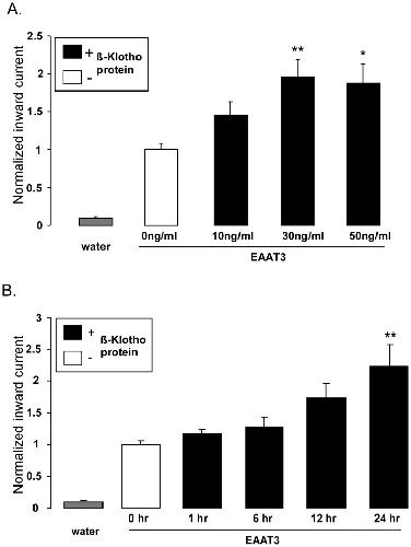 Figure 4. Effect of recombinant human β-Klotho protein on electrogenic glutamate transport in EAAT3 -expressing Xenopus oocytes.A: Means ± SEM (n = 7–16) of glutamate (2 mM)-induced current (Iglu) in Xenopus oocytes injected with water (grey bar) or injected with cRNA encoding EAAT3 and pretreated prior to measurements for 24 hours without (white bar) or with 10, 30 and 50 ng/ml recombinant human β-Klotho protein (1st, 2nd and 3rd black bar respectively).*,**(p<0.05, p<0.01) indicate statistically significant difference from untreated Xenopus oocytes (ANOVA). B: Means ± SEM (n = 12–17) of glutamate (2 mM)-induced current (Iglu) in Xenopus oocytes injected with water (grey bar) or injected with cRNA encoding EAAT3 pretreated prior to measurements with 30 ng/ml recombinant human β-Klotho protein for 0 hr (white bar) or 1, 6, 12 or 24hr (black bars respectively).**(p<0.01) indicates statistically significant difference from untreated Xenopus oocytes (ANOVA). |