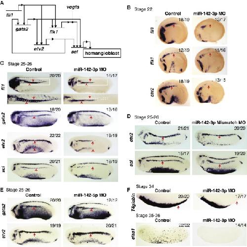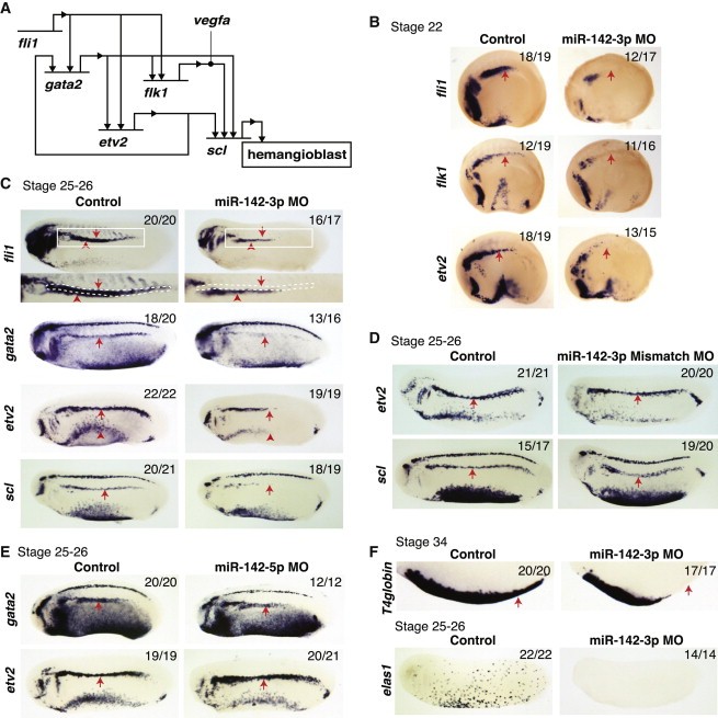 (B and C) Initiation of the hemangioblast program is defective in miR-142-3p MO embryos. (B) WISH showing that expression of early regulators, fli1, flk1, and etv2, is already highly reduced or absent in the DLP (arrows) in miR-142-3p morphants at stage 22 (initiation phase). (C) WISH analysis showing that the expression of hematopoietic gata2 and scl) and endothelial (fli1 and etv2) TFs in the DLP (arrows), are all dependent on miR-142-3p at stages 25â26. Boxed region of the fli1 panels is magnified to show that the expression of fli1 in the pronephric duct (arrowheads) abutting the DLP is unaffected in the morpants, whereas the expression of fli1 in the DLP (white dashed outline and arrows) is abrogated by the miR-142-3p MO. Formation of endothelial cells in the VBI is also disrupted by the MO as shown by reduced etv2 staining (arrowhead).