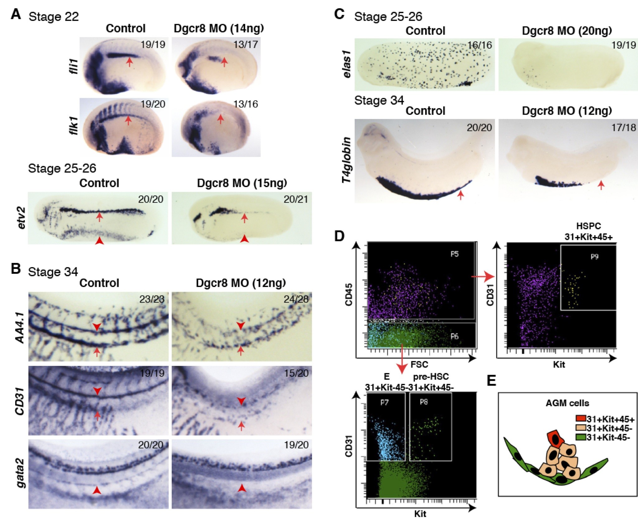 (B) miRNAs are required for HSC lineage specification. dgcr8 morphants do not produce hemogenic endothelium because of failure to correctly specify hemangioblasts in the DLP. Top: WISH showing Runx1 expression in the DA (arrowheads) at stage 39 is dependent on Dgcr8. Bottom: WISH showing loss of Flk1 expression in the DLP (arrows) of dgcr8 MOs at stage 24. Numbers of embryos represented by each panel, out of the number analyzed, are indicated in the top right corner. The anterior of the embryo is to the left and dorsal to the top in all images.