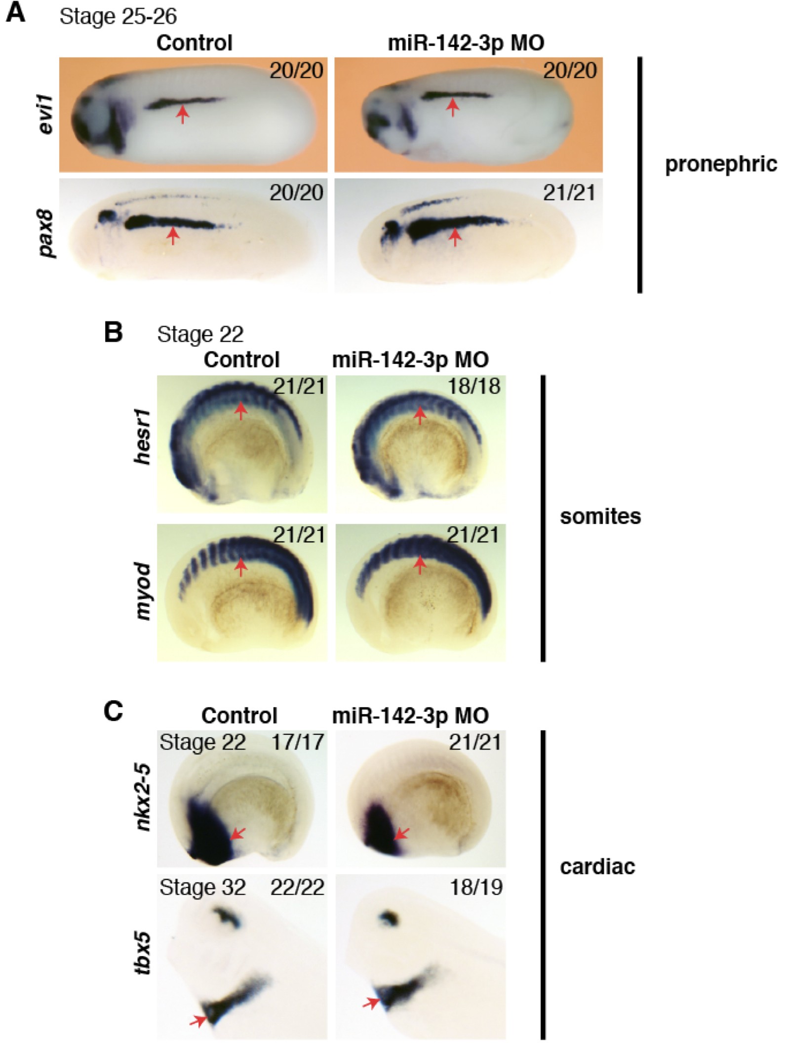 (B) WISH analysis at stages 25â26 showing that tgfbr1 expression is elevated in the DLP region (arrows) in miR-142-3p morphants.