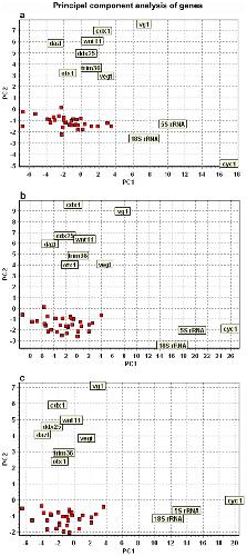 Figure 3. Principal component analysis of maternal genes.(A) 8-cell stage (four embryos/32 cells analyzed), (B) 16-cell stage (four embryos/64 cells analyzed), and (C) 32-cell stage (32 cells analyzed) embryos. Three clusters are seen in all the developmental stages. First cluster comprises 18S rRNA, 5S rRNA, and cyc1(mitochondrial cytochrome c); second cluster vg1, cdx1 (xcad2), wnt11, dazl, vegt, ddx25 (deadsouth), otx1, and trim36; third cluster (red squares) fzd7, par1, bmp2, pias1, dvl2, dvl3, lrp6, foxr1, fart1, mapk8, odc1, axin1, est1, U3 snoRNA, apc, gapdh, acta, eef1a1, tcf3, zpc, RNA polymerase II, gsk3b, maml1, tubb, ctnnb1 (β-catenin), mos, oct60, foxh1, stat3, and pax6. The animal-vegetal distinction is found along the y-axis (PC2), while differences in expression level of the maternal transcripts is reflected along the x-axis (PC1).