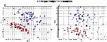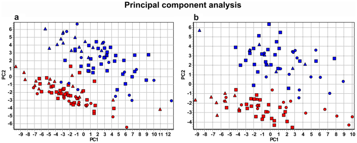 Figure 1. PCA of profiled blastomeres collected from early developmental stages of Xenopus laevis.Triangles indicate blastomeres from the 8-cell stage; squares from the 16-cell stage, and circles from the 32-cell stage. Blastomeres originating from the animal hemisphere are shown in red and those from the vegetal hemisphere are shown in blue. Left and right graphs are data from two different females (left: four embryos from 8-cell stage, four embryos from 16-cell stage, and one 32-cell stage embryo, in total 128 blastomeres; right: two embryos from 8-cell stage, three from 16-cell stage, and one from 32-cell stage, in total 96 blastomeres).