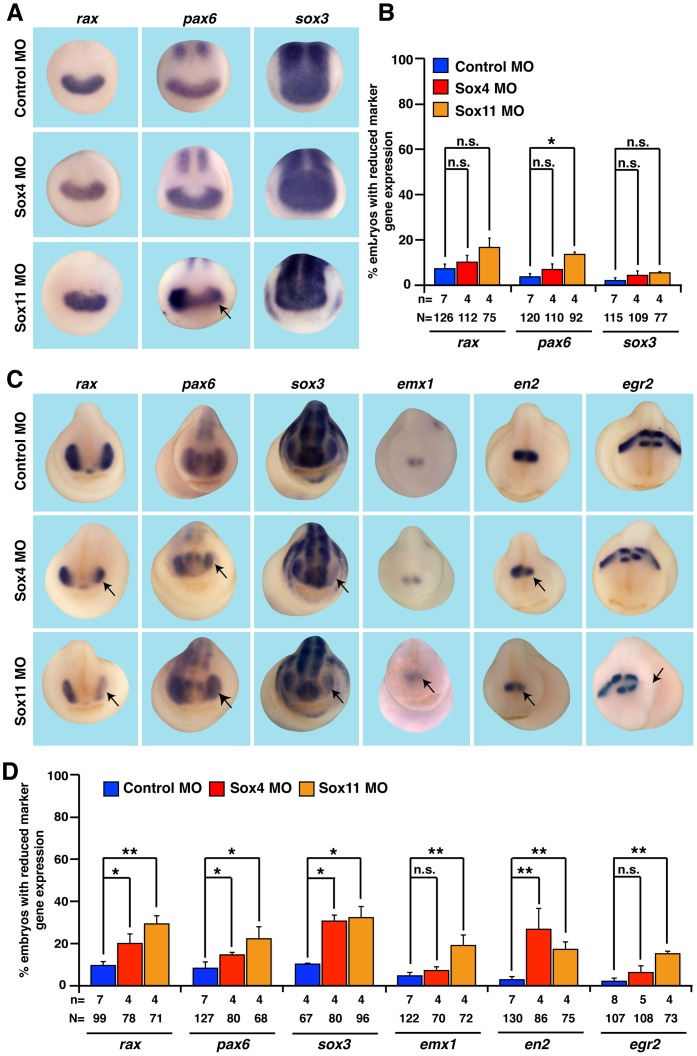 Figure 6. Eye-specific marker genes are unaffected upon loss of Sox4 or Sox11 function.A and B: Depletion of Sox4 function had no influence on marker gene expression at stage 13. Loss of Sox11 led to a slight decrease of pax6 expression. C and D: At stage 23, Sox4 depleted embryos revealed a reduced expression of rax, pax6, sox3 and en2. Emx1 and egr2 expression was not affected. In contrast, all marker genes were mildly affected upon Sox11 knock-down. B and D. Quantitative representations are given. nâ=ânumber of independent experiments, Nâ=ânumber of injected embryos analyzed, n.s.â=ânot significant, * Pâ¤0.05,** Pâ¤0.01. |