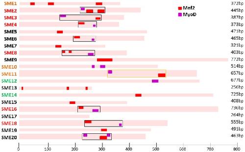 Figure 4. TFBS analysis.Top 20 predicted SMEs were examined for the presence of Mef2 and MyoD clusters. We found clusters of >2 Mef2/MyoD sites over regions >200 bp in all 6 SMEs shown to drive muscle expression in combination with γ-cry promoter (red) and 1/3 of the additional 3 enhancers that were found to drive muscle expression in combination with krt8 promoter only (orange). Two of the negative elements also displayed this cluster (SME6/SME20), but none of the enhancers found to express in tissues other than muscle (green).