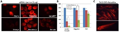 Figure 1. Comparing fluorescent reporter expression and transgenic efficiency in transgenic embryos generated by nuclear transfer, PiggyBAC or Tol2 transgenesis.Six red fluorescent proteins were examined for bright expression in Xenopus oocytes (A). Using the brightest red fluorescent gene, Katushka, constructs with a ubiquitous promoter (CMV) were examined by three methods: nuclear transfer, PiggyBAC transposition and Tol2 transposition. 250 embryos were injected in four independent experiments using CMV-Katushka constructs, and the number of surviving and transgenic embryos were assessed (Table S1); significantly fewer transgenic embryos (p-value <0.005) were generated by nuclear transfer and PiggyBAC, where large numbers of the surviving Tol2 embryos were transgenic (B). Tol2 transgenics were found to give the brightest and most reliable expression in Xenopus (C).