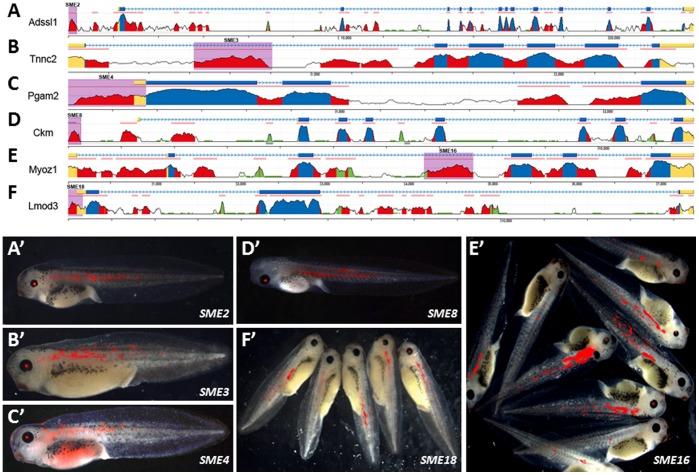 Figure 3. Validating computational predictions for muscle enhancers in Xenopus trangenics.Predicted SMEs corresponded to evolutionary conserved elements proximal or distal to genes known to function in skeletal muscle (A-F). Six SMEs consistently expressed in skeletal muscle, in addition to eye (A′–F′). Genomic regions are color coded as follows: exons (blue); UTRs (yellow); repeats (green); conserved noncoding sequences (red); predicted SMEs are shaded in purple.