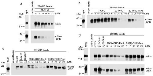 Figure 3. Oxysterols and 22-NHC bind the extracellular cysteine-rich domain (CRD) of vertebrate Smo(a) Secreted HA-tagged mSmoCRD and detergent extracts of 293T cells expressing mSmo-Cherry were tested for binding to 22-NHC beads, in the presence of free 22-NHC. MSmoCRD binds 22-NHC beads, similar to mSmo.(b) MSmoCRD binding to 22-NHC beads was assayed as in (a), in the presence of 7-OHC, 20-OHC or 20-OHC-Pent. Only the active sterols 20-OHC and 20-OHC-Pent compete mSmoCRD binding to 22-NHC beads, while the inactive 7-OHC does not.(c) As in (b) but in the presence of the diastereomers 20(S)-OHC-Pent and 20(R)-OHC-Pent. Only the active S diastereomer competes mSmoCRD binding to 22-NHC beads.(d) MSmoCRD and mSmo binding to 20-OHC beads was assayed as in (c). Both mSmoCRD and mSmo bind 20-OHC beads and are competed by 20(S)-OHC-Pent, but not 20(R)-OHC-Pent. The binding affinities of mSmoCRD and mSmo to 20-OHC beads are similar.The full immunoblots for this figure are shown in Supplementary figure 11.