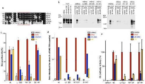 Figure 5. Oxysterol binding to Smo is required for high level Hh signaling(a) Alignment of a portion of CRDs of mouse Smo (mSmo), chicken Smo (gSmo), Xenopus Smo (xSmo), zebrafish Smo (zfSmo), Drosophila Smo (DrSmo) and mouse Fz8 (mFz8). The stretch indicated with red lines contains 5 residues that, in mFz8, contact the Xwnt8 palmityl moiety (Q71, F72, P74, L75 and I78).(b) Cherry-tagged mSmo, mSmoL112D, mSmoW113Y or mSmoS114Y were tested for binding to 22-NHC and 20-OHC beads, in the presence or absence of 20-OHC (100 μM). MSmoL112D and mSmoW113Y do not bind 22-NHC and 20-OHC beads. The full immunoblot is shown in Supplementary figure 11.(c) Smo−/− MEFs rescued with mSmo, mSmoL112D, mSmoW113Y or mSmoS114Y were incubated overnight with DMSO control, SAG (1 μM), 20-OHC (10 μM) or Shh. The graph shows the percentage of Smo-positive cilia. Error bars represent the sub-sampling standard deviation of the fraction of positive cilia (see Online Methods). Between 131–207 cilia were analyzed per condition. MSmoL112D and mSmoW113Y have a defective response to 20-OHC and Shh.(d) As in (c), but with box plots showing Smo fluorescence intensity at cilia. For each condition, the Smo signal was normalized to the intensity of the SAG treatment for the respective cell line.(e) As in (c), but cells were processed for Q-PCR, to measure Gli1 transcription. For each treatment, Gli1 levels were normalized to the level induced by SAG in the respective cell line. Error bars show standard deviation (n=3 independent experiments). MSmoL112D and mSmoW113Y do not respond to 20-OHC and have a reduced responsiveness to Shh.
