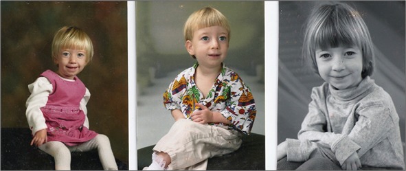 Figure 1. Pictures of the proband at ages 17 months, 36 months, and 6 years. Evident at age 17 months are the prominent eyes, hypertelorism, tubular nose, and retrognathia. Evident at age 36 months are a normal ear, retrognathia, and less pronounced hypertelorism. At age 6 years the inner canthal distance was within normal limits.
