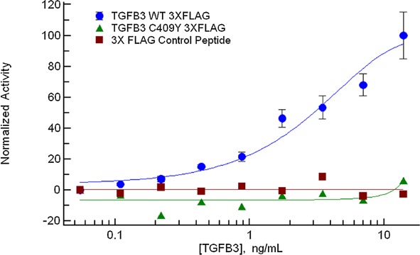 Figure 3. TGFB3C409Y does not activate TGF-β signaling. Constructs containing FLAG-tagged TGFB3WT and TGFB3C409Y were expressed in HEK293T cells and secreted FLAG-tagged proteins were immunoprecipitated under native conditions and normalized to anti-FLAG reactivity. Serial dilutions of these proteins were applied to HEK293T cells transfected with p3TP-Lux (TGF-β reporter) and pRL-CMV (normalizer). Error bars are standard error of the mean (N = 3).