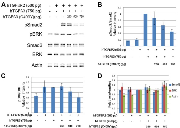 Figure 4. TGFB3C409Y acts as a dominant inhibitor of TGF-β signaling. Indicated amount of synthetic mRNAs were microinjected into Xenopus embryos after fertilization, and embryos harvested at Stage 9 for Western blot analysis. A representative Western blot is shown in A. BâD: Quantitation of densitometric analysis of three independent experiments is shown, measuring phosphorylated SMAD (pSMAD2) activation (pSMAD2/total SMAD2 ratio), pERK activation (pERK/ERK ratio), and total SMAD2, ERK, and cytoplasmic actin levels, respectively, following injection of mRNAs as indicated. Data are presented with error bars representing standard error of the mean. For each experiment, the intensity Western signal was standardized relative to the wild type TGFB/TGFBR2 co-injected condition (lane 3 of panels BâD).