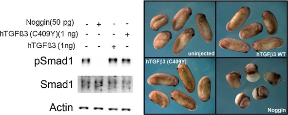 Figure 5. TGFB3C409Y does not disrupt BMP signaling during Xenopus gastrulation. Indicated amounts of synthetic mRNAs for human TGFB3, TGFB3C409Y and Xenopus Noggin were injected into Xenopus laevis embryos to assay perturbations of BMP signaling during gastrulation. The levels of C-terminal phosphorylated SMAD1 (pSMAD1) were examined by immunoblotting. SMAD1 and actin were used as loading controls. Pictured in the lower panel are intact embryos; the BMPR antagonist Noggin disrupts gastrulation while TGFB3C409Y does not.