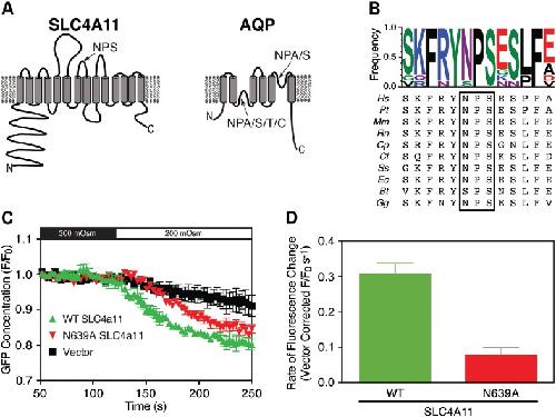 Figure 3. Loss of water-flux upon mutation of an NPS motif. (A) Schematic topology models for SLC4A11 and for the AQP family of proteins, with the outside of the cell at the top. Positions of conserved AsparagineâProline-X (NPX) motifs are indicated by arrows. (B) Amino acid sequence alignments of the region around the NPX motif found in SLC4A11 (boxed). Species are: Human (Homo sapiens (Hs)), Chimpanzee (Pan troglodytes (PT)), Mouse (Mus Musculus, Mm), Rat (Rattus norvegicus, Rn), Guinea pig (Cavia porcellus, Cp), Dog (Canis lupus familiaris, Cl), Pig (Sus Scrofa, Ss), Horse (Equss caballus, Ec), Cattle (Bos Taurus, Bt) and Chicken (Gallus gallus, Gg). The degree of conservation is indicated at the top by amino acid frequency, represented by the relative height of each single-letter coded amino acid (WebLogo software) (47). (C) Water permeability of HEK293 cells expressing WT or N639A SLC4A11 was assessed, by following the rate of change of eGFP fluorescence after cells were exposed to hypotonic medium. (D) Comparison of WT and N639A rates of cell swelling following hypo-osmotic challenge. The rate of fluorescence change was corrected for activity of vector-transfected cells (0.19 ± 0.02 sâ1). Data represent mean ± SE of three independent swelling experiments with 30â40 cells measured per assay. |