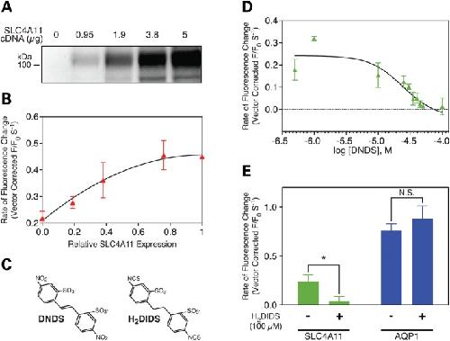 Figure 4. Water-flux is proportional to SLC4A11 expression level and is inhibited by stilbene disulfonates. (A and B) HEK293 cells were co-transfected with eGFP cDNA and indicated amount of cDNA encoding HA-tagged wild-type (WT) SLC4A11. (A) SLC4A11 expression was quantified on immunoblots of cell lysates probed with anti-HA antibody. (B) Cell swelling of HEK293 cells, expressing various amounts of SLC4A11, was assessed by the eGFP dilution assay (as in Fig. 2C). The rate of swelling observed for vector-alone transfected cells was subtracted from the values observed for cells expressing SLC4A11. (C) Chemical structures of SLC4A11 inhibitors used here. (D and E) HEK293 cells were co-transfected with eGFP and either SLC4A11, AQP1 or vector cDNA. Water-flux following shift to hypo-osmotic medium, assessed by measuring the rate of eGFP fluorescence change (as in Fig. 2C), was corrected for rate in vector-transfected cells. (D) Water-flux assays were performed in the presence of varied concentrations of DNDS, a non-covalently acting compound classically used to inhibit proteins of the SLC4 family (48). Half-maximal effective concentration determined from the curve is 24 ± 1 µM DNDS, n = 3. (E) eGFP dilution water-flux assays were performed in the absence or presence of 100 µM H2DIDS, a covalently acting stilbene disulfonate. Rates of fluorescence change were corrected for the value found for vector-transfected cells. *P < 0.05. N.S., not significant. n = 3. |