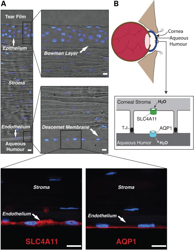 Figure 6. SLC4A11 and AQP1 in human cornea. (A) Bright field and confocal immunofluorescence microscopy images of paraffin-embedded human cornea. Cornea sections were incubated with rabbit anti-SLC4A11 or rabbit anti-AQP1 serum, followed by goat anti-rabbit IgG conjugated with Alexa Fluor 594 (red). Nuclei were detected with DAPI (blue). Scale bars represent 10 µm. (B) The endothelial cell layer separates the corneal stroma from the aqueous humour. Fluid accumulates in the stroma, which is reabsorbed by the endothelial cell layer to prevent corneal oedema. Localization of AQP1 and SLC4A11 to opposite poles of endothelial cells suggests they may work cooperatively to provide a water conductive pathway through the endothelial layer. T.J. represents the tight junction that connects cells of the endothelium. |