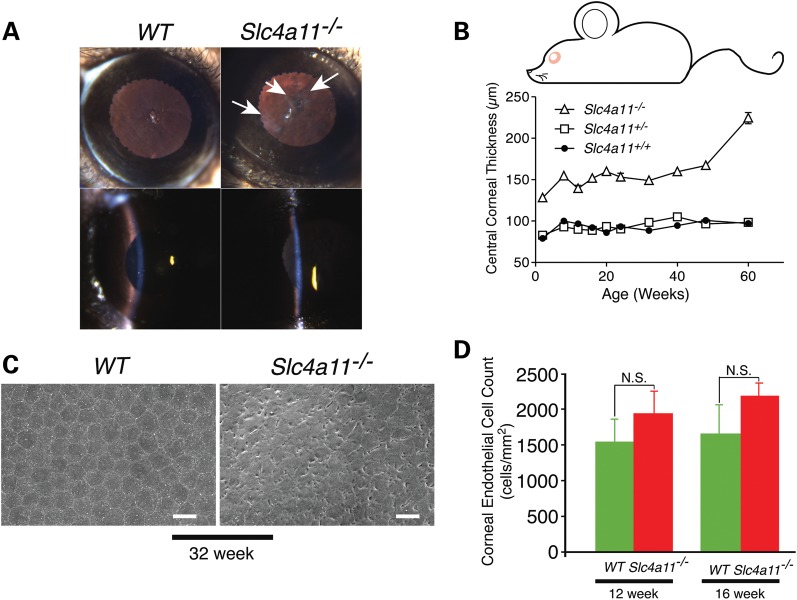 Figure 5. Corneal oedema and progressive corneal dysfunction in slc4A-a11−/− mice. (A) Slit lamp examination of WT and slc4a11−/− mice. Corneas of 48-week WT and slc4a11−/− mice seen under retro-illumination (top panels) and examined using tangential slit illumination (bottom panels). Arrows indicate corneal haze observed in slc4a11−/− mice. (B) Corneal thickness measured by in vivo confocal microscopy (n = 5 per genotype). Central corneal thickness was significantly different between WT and slc4a11−/− mice at all time points (P < 0.01). The corneal thickness in heterozygous (slc4a11+/−) mice was not different compared with wild-type mice. (C) Scanning electron micrographs of corneal endothelia from WT and slc4a11−/−mice at 32 weeks. Scale bars are 20 µm. (D) Statistical analysis of corneal endothelial cell density. |