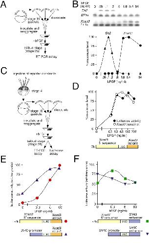 Fig. 2. Analysis of Fgf response element (FRE) of Xcad3. (A) Experimental design for the embryonic cell culture assay used in B. Ectodermal tissues were isolated from stage 10 gastrula embryos. The dissociated cells were inoculated into microculture wells at 200 cells/well. After completion of reaggregation by brief centrifugation, cells were cultured in the presence of increasing concentrations of bFgf until control embryos reached stage 23. The transcriptional levels of two position-specific neural markers were analyzed by RT-PCR (Kengaku and Okamoto, 1995). (B) High-dose-dependent activation by Fgf of endogenous Xcad3. Autoradiographs are shown of RT-PCR products of the transcripts from En2, an anterior neural marker gene and Xcad3, both of which were co-amplified with EF1α transcript, an internal standard (upper panels). Each RT-PCR product was quantified by a laser image analyzer and values for En2 (â´) and Xcad3 (δ) transcripts normalized to EF1α transcript are presented as percentages of the respective maximum value and plotted against bFgf dose (graph). (C) Experimental design for the embryonic cell culture assay used in D. Xcad3/LUC reporter and pRL-CMV plasmids were coinjected into four animal blastomeres of eight-cell stage embryos. When they reached stage 10, ectodermal tissues were isolated and processed as in A. To compare directly Fgf dose-dependence of Xcad3/LUC reporter with that of endogenous Xcad3, two parallel sets of cultures were prepared; one was assayed for luciferase activity, while the other was assayed for transcriptional levels of endogenous Xcad3. (D) Comparison of the Fgf dose-dependence profiles for a Xcad3/LUC reporter and endogenous Xcad3. Eight-cell stage embryos were injected with a Xcad3/LUC reporter depicted below the graph and an internal standard plasmid pRL-CMV and processed as described in C. Normalized Xcad3/LUC reporter activities are presented as percentages of the maximum value and plotted against bFgf dose (δ). Transcript levels of endogenous Xcad3 was assayed and plotted as in B (â). (E,F) Presence of FRE in the intron 1. Chimeric constructs injected are indicated below each graph: they contained either Xcad3 intron1 (E) or SV40 enhancer sequence (F). Reporter activities of these constructs were analyzed as in D and presented in arbitrary units. Note that inclusion of intron1 sequence in reporter constructs is essential for dose-dependent response to Fgf. |