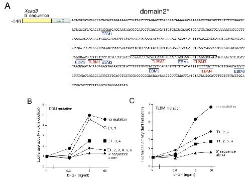 Fig. 4. EBMs and TLBMs as sub-elements of FREs. (A) Nucleotide sequence of the domain 2* region of Xcad3 intron 1. EBMs and TLBMs are marked and numbered. (B,C) Mutational analysis of EBMs (B) and TLBMs (C). Reporter constructs examined contain the domain 2* fragments that carry various combinations of mutations in EBMs or TLBMs, as indicated to the right of each graph (E1, 3 means that EBM1 and EBM3 are mutated). Mutations were introduced as follows: GAA to agA in E1, 2 and 4; TCC to ctC in E3 and 5; ATCCT to gTCga in E6; TTTGT to Tcgag in T1; TCAAA to TagAc in T2; TCAAAGG to Tgtcgac in T3; CTTTG to gaaTt in T4. Reporter activities of mutated constructs were analyzed as in Fig. 3, except that ectoderm cells were cultured in the absence or presence of increasing concentrations of bFgf. |