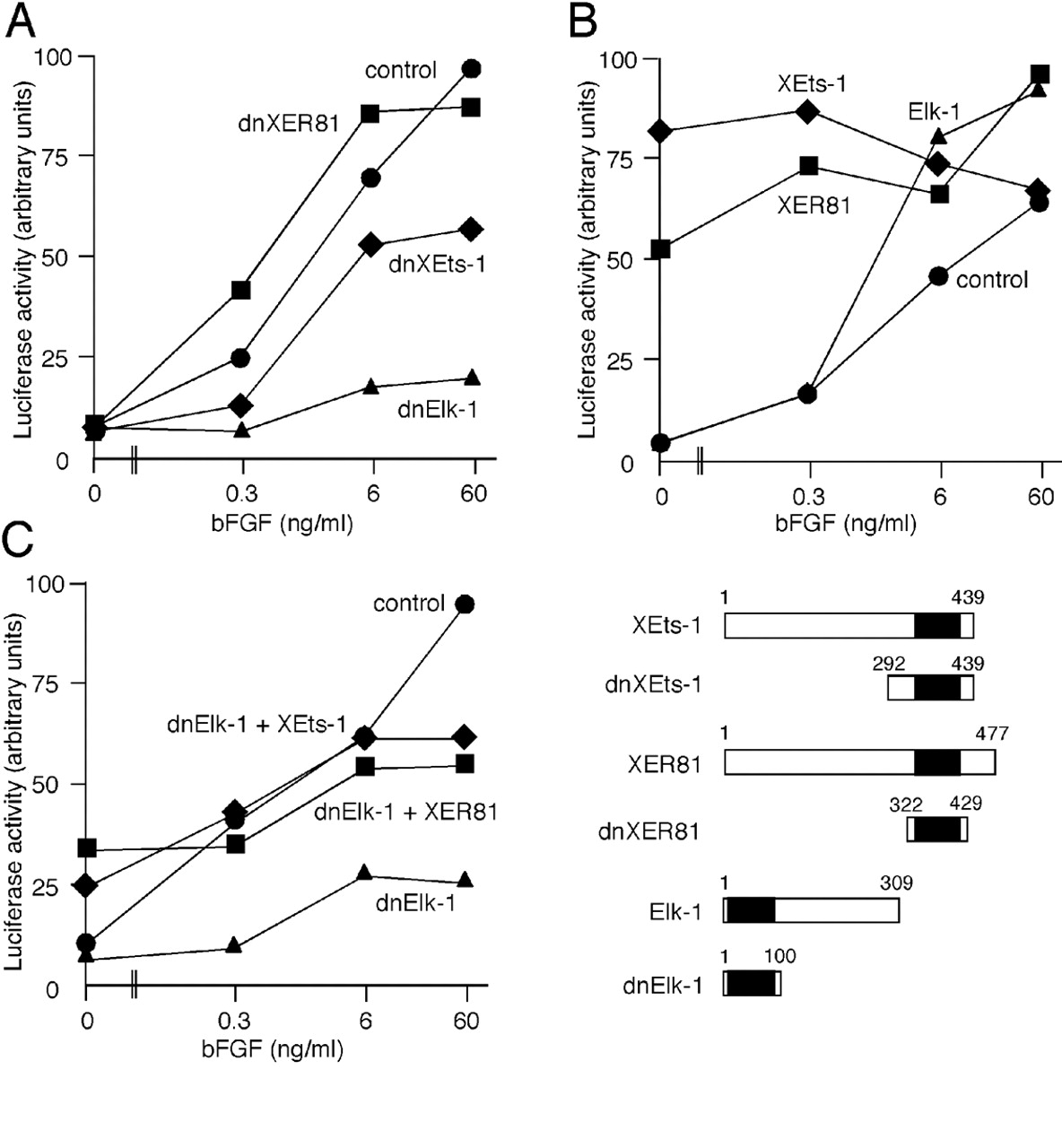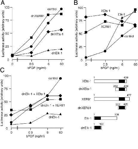 Fig. 5. Involvement of Ets transcription factors as activators in the Fgf response of Xcad3. Structural features of Ets proteins and their derivatives examined are illustrated at the bottom right. Black boxes represent the DNA-binding ets domains. Synthetic mRNAs encoding these proteins were coinjected with â546/LUC/intron1 and pRL-CMV into two animal blastomeres (either left or right side) of eight-cell stage embryos, which were then processed as in Fig. 2C. Reporter activity was analyzed as in Fig. 2D and presented in arbitrary units. (A) Effects of dominant-negative Ets proteins on the Fgf response of Xcad3/LUC. The injected amount was 32 pg/blastomere for dnElk1 (â´), dnXEts1 (â¦), dnXER81 (âª) and EnR (δ) mRNA (control). (B) Effects of wild type Ets proteins on the Fgf response of Xcad3/LUC. The injected amounts are 30 pg/blastomere for Elk1 (â´), XEts1 (â¦), XER81 (âª) and EnR (δ) mRNA. Note that XEts1 and XER81 activate the reporter gene more efficiently than Elk1. (C) Reversal of dnElk1 induced suppression of Fgf response by XEts1 and XER81. The injected amounts were 24 pg, 48 pg, 72 pg and 96 pg/blastomere for dnElk1, XEts1, XER81 and EnR mRNA. The total amount of injected mRNA was adjusted by adding neutral EnR mRNA. Note that the suppression of reporter gene expression induced by dnElk1 (â´) is reversed by the addition of XEts1 (â¦) or XER81 (âª). |
