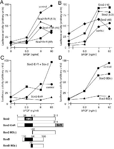 Fig. 7. Involvement of Sox2 as a co-activator in the Fgf response of Xcad3. Structural features of Sox2, its derivatives and SoxD BD(â) examined are illustrated at the bottom. DNA-binding HMG domains and EnR repressor domain are marked. Experimental procedures are as described in Fig. 5 except that the reporter construct (â546/LUC/domain2*) was used in C. (A) Effects of dominant negative Sox2 on the Fgf response of Xcad3/LUC. The injected amounts were 5.3 (â´), 16 (â¦) or 48 (âª) pg Sox2-EnR mRNA/blastomere. Sox2-EnR suppresses the Fgf response of the reporter construct (â546/LUC/intron1) in a dose-dependent manner. (B) Effects of wild-type Sox2 on the Fgf response of Xcad3/LUC. The injected amounts were 5.3 (â´), 16 (âª) or 48 (â¦) pg Sox2 mRNA/blastomere. (C) Reversal of Sox2-EnR induced suppression of Fgf response by wild-type Sox2. The injected amounts were 16 pg, 96 pg and 112 pg/blastomere for Sox2-EnR, Sox2 and EnR mRNA. Note that the suppression of reporter gene (â546/LUC/domain2*) expression induced by Sox2-EnR (â´) is reversed by the addition of Sox2 (âª). (D) Effects of Sox2 BD(â) (â´) and SoxD BD(â)(âª) on the Fgf response of Xcad3/LUC. The injected amounts were 160 pg/blastomere for both Sox2 BD(â) and SoxD BD(â) mRNA. |