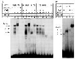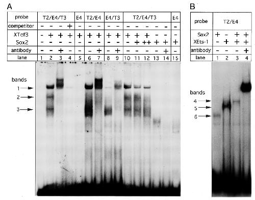 Fig. 8. Direct interaction of EBM and TLBM with XTcf3, Sox2 and XEts1 proteins. An end-labeled probe, either wild type or mutated, was incubated with XTcf3 or Sox2, or with a combination of both proteins in A, and with Sox2 or XEts1, or with a combination of both proteins in B, as indicated in diagrams above. All proteins were tagged with a V5 epitope and made by in vitro translation. Probe T2/E4/T3: an intronic DNA fragment containing TLBM2, 3 and EBM4 (overlined in Fig. 4A). Probe E4: TLBM2 and 3 mutated. Probe T2/E4: TLBM3 mutated. Probe E4/T3: TLBM2 mutated. Mutations were introduced as described in Fig. 4. Unlabeled probe (competitor) or antibody against V5 epitope was added as indicated in the diagrams. |