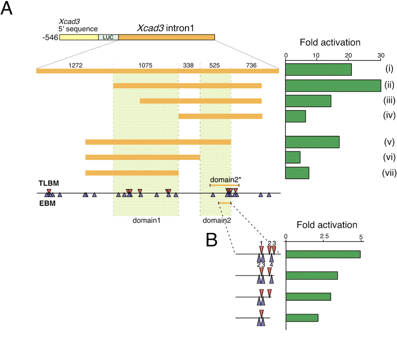 Fig. 3. Identification of multiple FREs within the intron 1. (A) Deletion and sequence analysis of the intron 1. Reporter constructs examined contain intron 1 sequences that are deleted to various extents as depicted left of the histogram. Reporter activities of these constructs were analyzed as in Fig. 2, except that ectoderm cells were cultured in the absence or presence (6 ng/ml) of bFgf. The ratio of the luciferase activity obtained with bFgf to that obtained without bFgf is taken as a measure of Fgf responsiveness and presented as a value of fold induction in the histograms. Numbers on full-length intron 1 indicate nucleotide length of respective segments. Multiple FREs appear to be distributed within domain1 and domain 2 (light green) of intron 1. Domain 2*, as defined in the text, is also indicated close to domain 2. Sequence analysis of intron1 reveals that a number of Ets-binding motifs (EBM; A/CGGAA/T) and Tcf/Lef-binding motifs (TLBM; CTTTGA/TA/T) are present throughout intron1 as indicated by blue and red triangles, respectively. (B) Deletion analysis of a 209 bp fragment within domain 2*. Consecutive deletion of binding motifs TLBM3, EBM4 and TLBM2, as indicated left of the histogram results in a progressive reduction of Fgf responsiveness. Numbered red and blue triangles point to the position of TLBMs and EBMs in the 209 bp fragment, respectively (see Fig. 4A for precise location). |