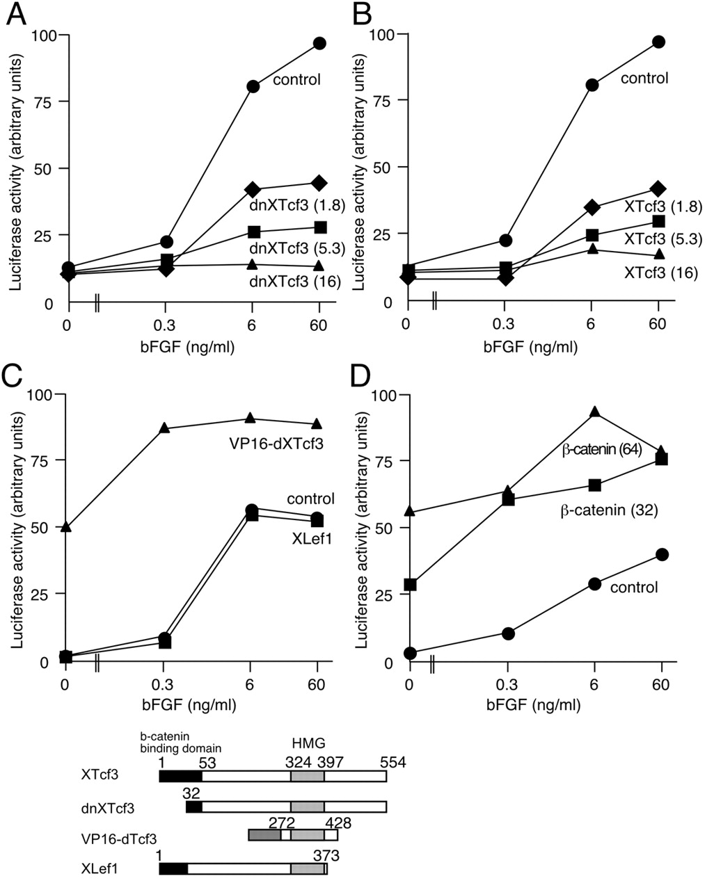 Fig. 6. Involvement of XTcf3 as a repressor in the Fgf response of Xcad3. Structural features of XTcf3, its derivatives and XLef1 examined are illustrated at the bottom. β-catenin binding domains, VP16 activation domain and DNA-binding HMG domains are marked. Experimental procedures are as described in Fig. 5. (A) Effects of dominant-negative XTcf3 on the Fgf response of Xcad3/LUC. The injected amounts were 1.8 (â¦), 5.3 (âª) or 16.0 (â´) pg dnXTcf3 mRNA/blastomere. (B) Effects of wild-type XTcf3 on the Fgf response of Xcad3/LUC. The injected amounts were 1.8 (â¦), 5.3 (âª) or 16.0 (â´) pg XTcf3 mRNA/blastomere. (C) Effects of XLef1 and VP16-dXTcf3 on the Fgf response of Xcad3/LUC. The injected amount was 6 pg/blastomere for XLef1 (âª), VP16-dXTcf3 (â´) and EnR mRNA (δ). VP16-dXTcf3 enhances the Fgf response of the reporter construct (â546/LUC/intron1), but XLef1 does not. (D) Effects of β-catenin on the Fgf response of Xcad3/LUC. The injected amounts were 32 (âª) or 64 (â´) pg β-catenin mRNA/blastomere. |