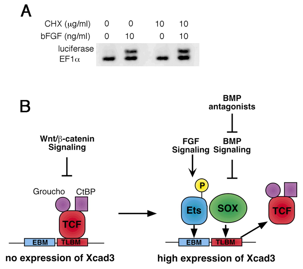 Fig. 9. Intron 1 as an immediate early target of Fgf signaling (A) and a proposed model of integration of multiple signaling pathways on FREs of Xcad3 intron1 (B). In A, experimental design was essentially the same as in Fig. 2C, except for the following changes. A reporter construct (â546/LUC/intron1) was injected into animal blastomeres of eight-cell stage embryos. Ectodermal cells at stage 10 were cultured for 30 minutes with or without 10 μg/ml cycloheximide and then for an additional 1.5 hours with or without bFgf (10 ng/ml). The transcriptional levels of the reporter gene (luciferase-coding portion) were analyzed by RT-PCR. |